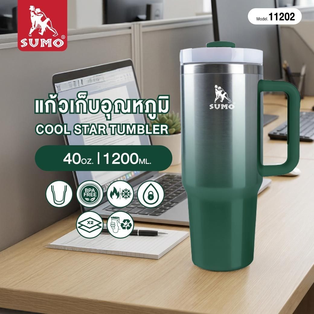 แก้วเก็บอุณหภูมิSUMOสีเขียวไล่เฉด ฝาหมุนสไลด์เปิด-ปิดง่ายด้วยมือเดียว หูจับแข็งแรง ออกแบบตามหลักสรีระขณะจับถือ ขนาดใหญ่จุใจ 1200 ml เก็บอุณหภูมิได้ทั้งร้อน และเย็น