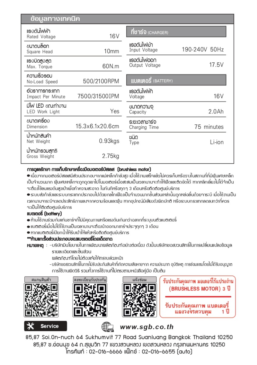 รายละเอียด (Specification) แรงดันไฟฟ้า (VOLTAGE) 16V ขนาดความจุ (BATTERY CAPACITY) 2.0 Ah ชนิด (TYPE) Li-ion ความเร็วรอบ (NO-LOAD SPEED) 500/2100 RPM แรงบิดสูงสุด (MAX TORQUE) 60 Nm อัตราการกระแทกสูงสุด (IMPACT RATE) 7500/31500 IPM ขนาดบล็อก (SQUARE HEAD) 10 mm ระบบหมุน (ROTATION DIRECTION) ซ้าย–ขวา มีไฟLED ขณะทำงาน(LED WORK LIGHT) Yes มอเตอร์ (MOTOR) มอเตอร์ไร้แปรงถ่าน การแรงดันไฟฟ้าขาเข้าเครื่องชาร์จ (CHARGER INPUT VOLTAGE) 190–240V 50Hz แรงดันไฟฟ้าขาออกเครื่องชาร์จ (CHARGER OUTPUT VOLTAGE) 17.5V ระยะเวลาชาร์จ (CHARGING TIME) 75 minutes น้ำหนักสินค้า (NET WEIGHT) 0.93 kgs น้ำหนักรวมสุทธิ (GROSS WEIGHT) 2.75 kgs ขนาดเครื่อง (DIMENSION) 15.3x6.1x20.6 cm อุปกรณ์ในชุด (ACCESSORIES) แท่นชาร์จ, แบตเตอรี่, คู่มือ