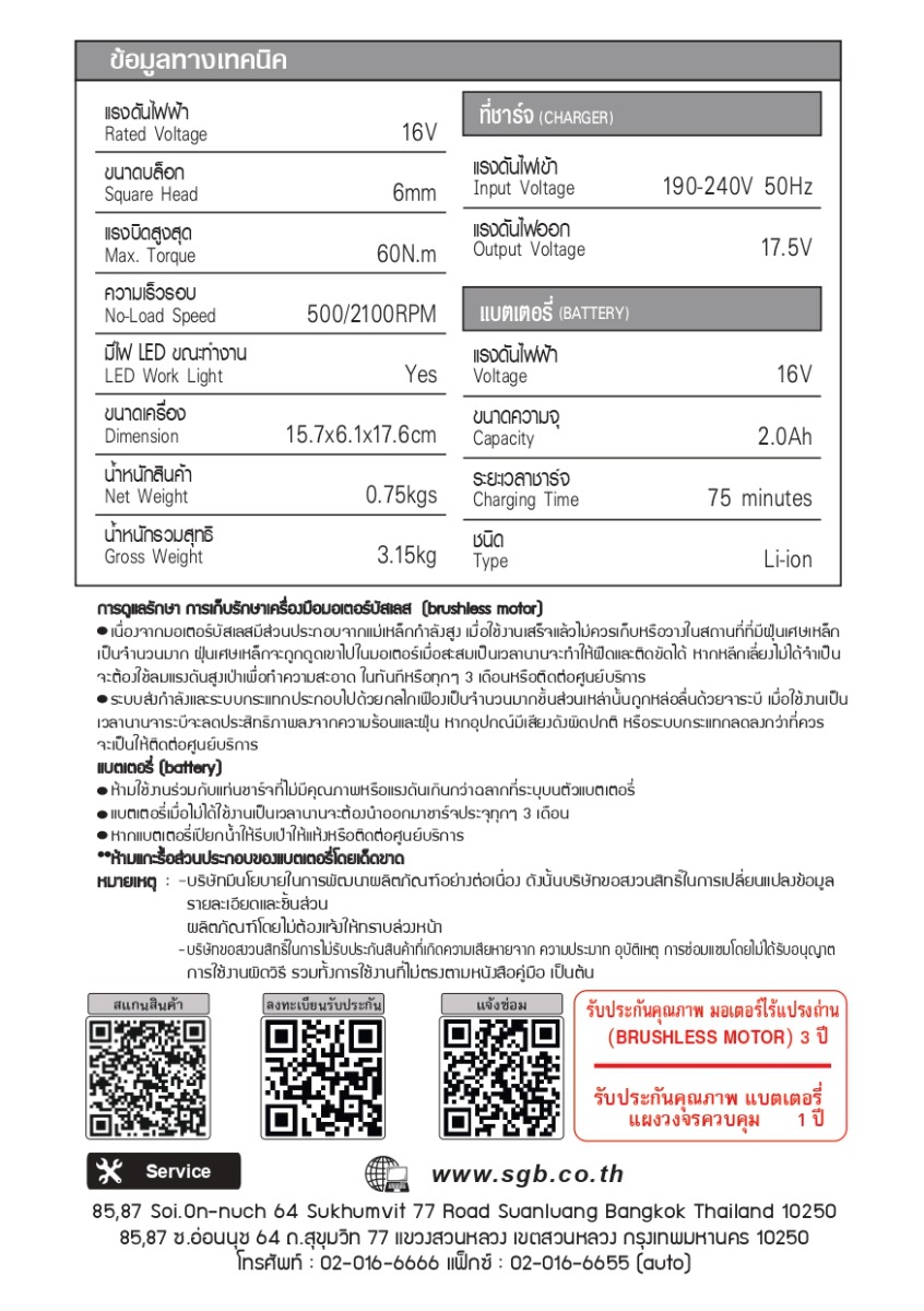 รายละเอียดทางเทคนิค (Specification) แรงดันไฟฟ้า (VOLTAGE) 16V ขนาดความจุ (BATTERY CAPACITY) 2.0 Ah ชนิด (TYPE) Li-ion ความเร็วรอบ (NO-LOAD SPEED) เกียร์ต่ำ 0–500 RPM / เกียร์สูง 0–2100 RPM แรงบิดสูงสุด (MAX TORQUE) 60 Nm หัวจับดอกสว่าน (DRILL CHUCK) Ø1.5–10 มม. หัวจับดอกไขควง (SCREWDRIVER BIT HOLDER) 6 มม. Hex ปรับแรงบิด (TORQUE SETTING) 20 ระดับ + โหมดเจาะ ระบบหมุน (ROTAtTION DIRECTION) ซ้าย–ขวา มีไฟLED ขณะทำงาน(LED WORK LIGHT) Yes มอเตอร์ (MOTOR) มอเตอร์ไร้แปรงถ่าน การแรงดันไฟฟ้าขาเข้าเครื่องชาร์จ (Charger Input Voltage) 190–240V 50Hz แรงดันไฟฟ้าขาออกเครื่องชาร์จ (Charger Output Voltage) 17.5V ระยะเวลาชาร์จ (CHARGING TIME) 75 minutes น้ำหนักสินค้า (NET WEIGHT) 0.75 kgs น้ำหนักรวมสุทธิ (GROSS WEIGHT) 3.15 kgs ขนาดเครื่อง (DIMENSION) 15.7x6.1x17.6 cm อุปกรณ์ในชุด (ACCESSORIES) หัวเปลี่ยนเร็ว 5 แบบ, แท่นชาร์จ, แบตเตอรี่, คู่มือ