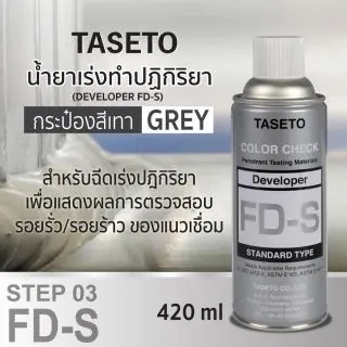 • พ่นสเปรย์น้ำยาเร่งปฎิกิริยา กระป่องสีขาว ( FD-S) บางๆ ลงบนพื้นผิวที่ต้องการทดสอบแล้วทิ้งระยะเวลา ที่แนะนำ 7-30 นาทีขึ้นอยู่กับสภาพชิ้นงาน