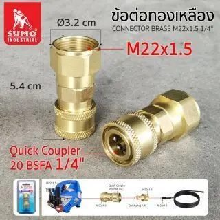 Buy ข้อต่อทองเหลือง 1/4"/M22x1.5 ข้อต่อทองเหลือง 1/4"/M22x1.5 เป็นฟังก์ชั่นเสริม เปลี่ยนข้อต่อเกลียว เป็นปลั๊กสวมเร็วเพื่อความสะดวกในการใช้งาน แรงดันสูงสุด (Max. Pressure) 350bar อุณหภูมิ สูงสุด (Max. temp) 60°C