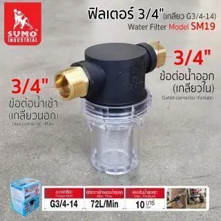 Buy ฟิลเตอร์ 3/4" (เกลียว G3/4-14) รุ่น SM19 SUMO ฟิลเตอร์ 3/4" (เกลียว G3/4-14) รุ่น SM19 SUMO อุปกรณ์เครื่องอัดฉีด ฟิลเตอร์สำหรับ ปั๊มน้ำ ฟิลเตอร์กรองน้ำ เฉพาะจุด เช่น กรองแท้งค์น้ำ สำหรับ เครื่องซักผ้า เครื่องอัดฉีด ช่วยให้เครื่องสุขภัณฑ์ภายในบ้านสะอาด ปลอดภัยจากความขุ่น ของตะกอนเศษ ดิน โคลน สิ่งสกปรกที่มาจากน้ำ สามารถใช้ร่วมกับปั๊มน้ำและเครื่องอัดฉีดโครงสร้างทนทาน สามารถทนแรงดันได้ถึง 12 บาร์ ตะแกรงสแตนเลสมีขนาดความละเอียด 40 mesh stainless screen ติดตั้งได้ง่ายกับเครื่องอัดฉีดหรือ หัวก๊อกน้ำตามบ้านเรือน สามารถถอดทำความสะอาดได้ง่าย ขนาดเกลียว : BSP G3/4-14 อัตราการไหลของน้ำสูงสุด : 72L/Min แรงดันน้ำ : 10 Bar น้ำหนัก : 189 g