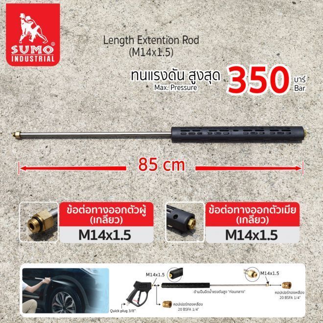 Buy ท่อนกลางปืนฉีดน้ำแรงดันสูง 85 ซม. SUMO ท่อนกลางปืนฉีดน้ำแรงดันสูง 85 ซม. (M14x1.5) ท่อสแตนเลสไร้รอยต่อ สำหรับเครื่องฉีดน้ำแรงดันสูง เกลียว M14x1.5 ทั้งสองด้าน และมี ด้ามจับไนลอน แรงดันสูงสุด (Max. Pressure) : 350 bar ข้อต่อทางออกตัวผู้ (Screw Connector Outlet Male) : M14x1.4 ข้อต่อทางออกตัวเมีย (Screw Connector Outlet Female) : M14x1.5
