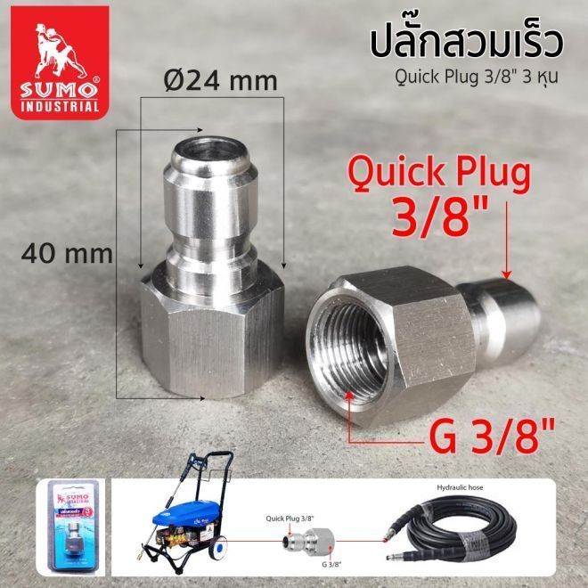 Buy ปลั๊กสวมเร็ว 3/8" SUMO ปลั๊กสวมเร็ว 3 หุน เป็นฟังก์ชั่นเสริม เปลี่ยนข้อต่อเกลียวเป็นปลั๊กสวมเร็วเพื่อความสะดวกในการใช้งาน ข้อต่อทางเข้าตัวเมียเกลียวใน : G3/8" bar แรงดันสูงสุด : 350bar อุณหภูมิ สูงสุด : 60°C