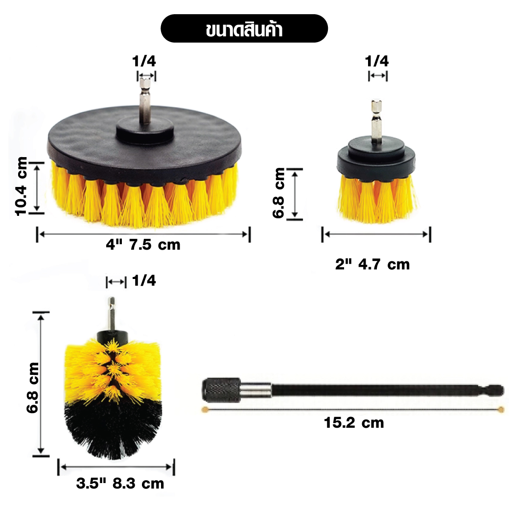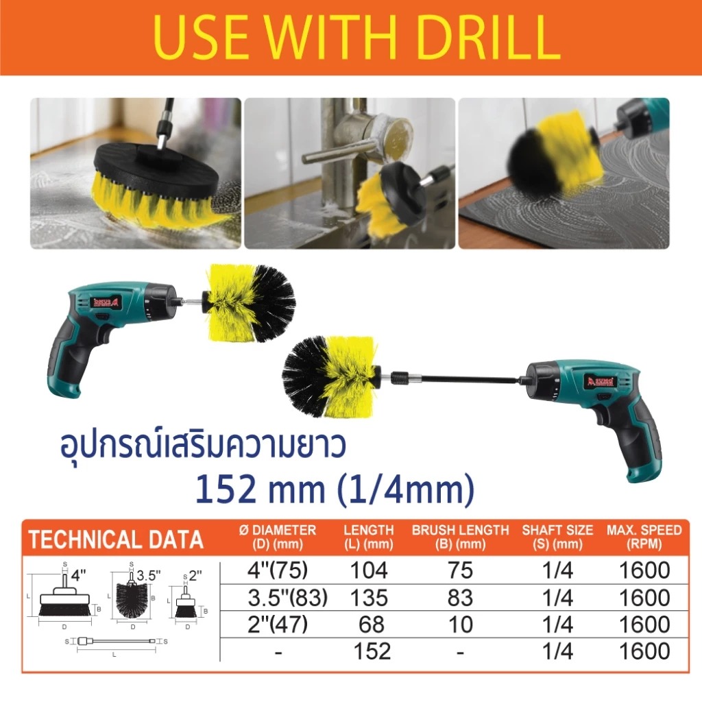 3 หัวแปรงทำความซอกเล็กหรือพื้นผิวใหญ่ได้สะอาดหมดจด ไม่สร้างรอยบนพื้นผิว ประหยัดแรงและเวลาโดยใช้คู่กับสว่าน