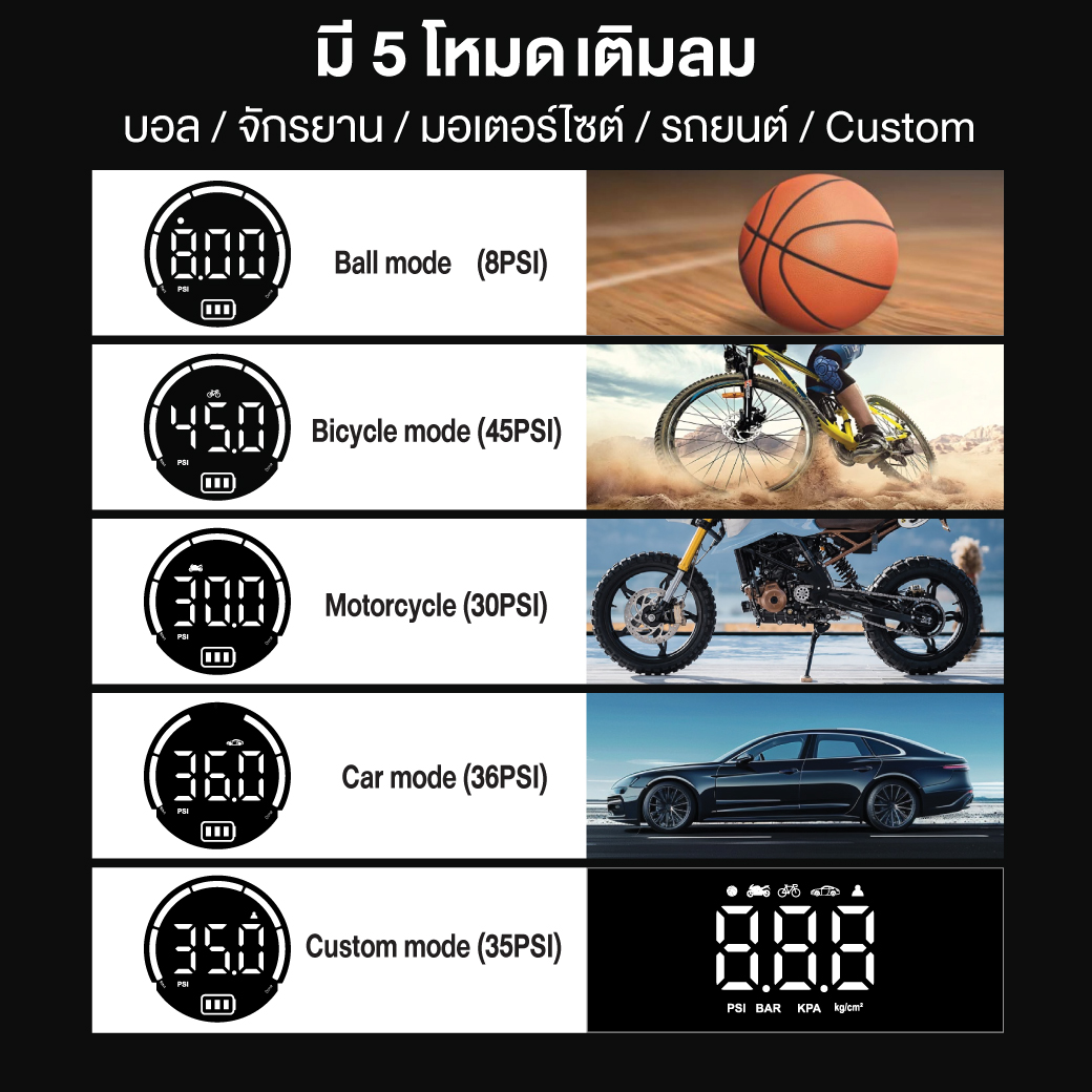 • ใช้งานได้กับลูกบอล รถจักรยาน รถมอเตอร์ไซค์ รถยนต์ และอุปกรณ์ที่รองรับแรงดันลมไม่เกิน 150PSI