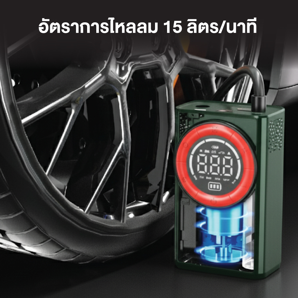 เครื่องเติมลมไร้สายแบบพกพา แรงดันลมสูงสุด 150 PSI เติมลมเร็ว 15 ลิตร/นาที มีระบบตัดอัตโนมัติเมื่อเติมลมเต็มและตรวจสอบแรงดันลมได้