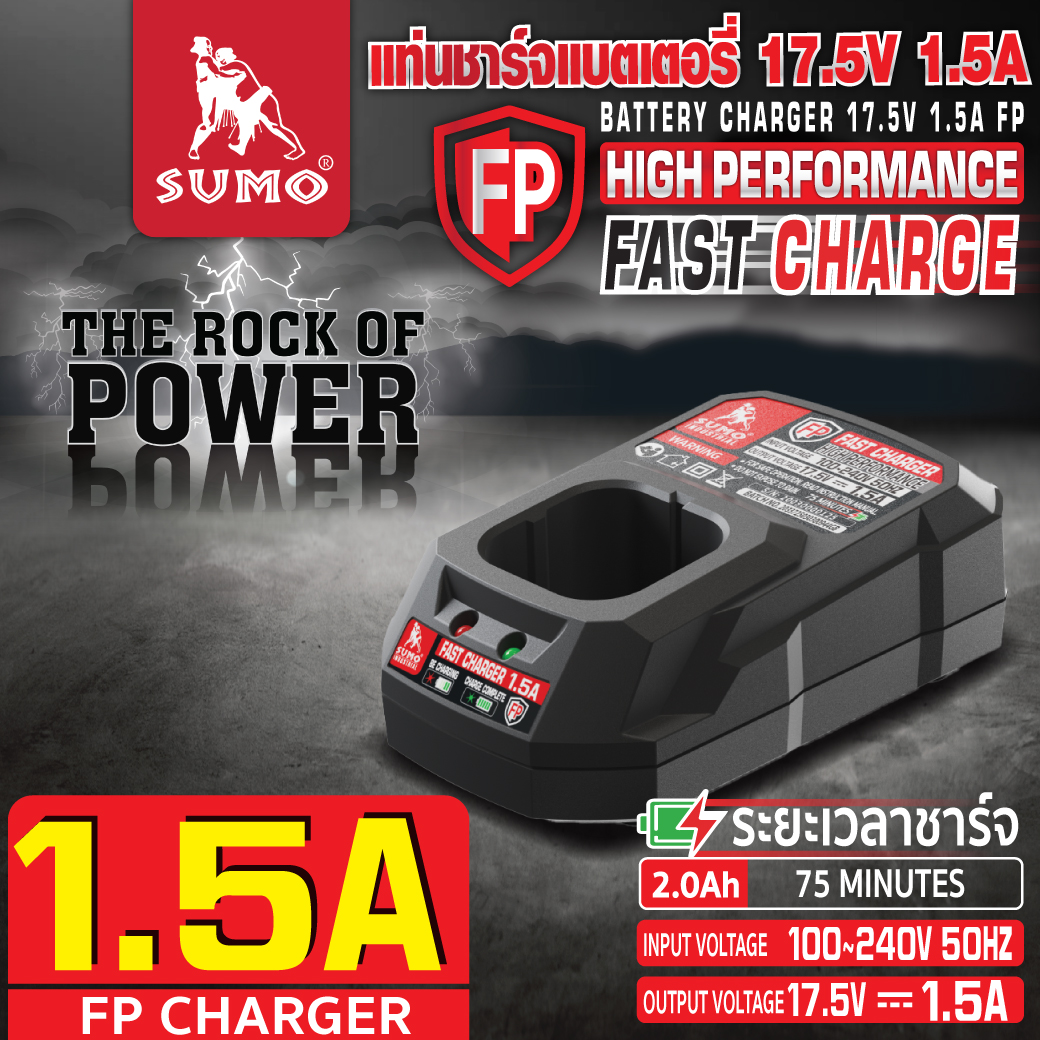 แท่นชาร์จแบตเตอรี่ 17.5V 1.5A FP ออกแบบให้ชาร์จเร็ว ปลอดภัย และมีระบบตัดไฟอัตโนมัติเมื่อชาร์จเต็ม ป้องกันไฟเกินและความร้อนสูง โครงสร้างพลาสติกทนความร้อน แข็งแรง น้ำหนักเบา พกพาสะดวก