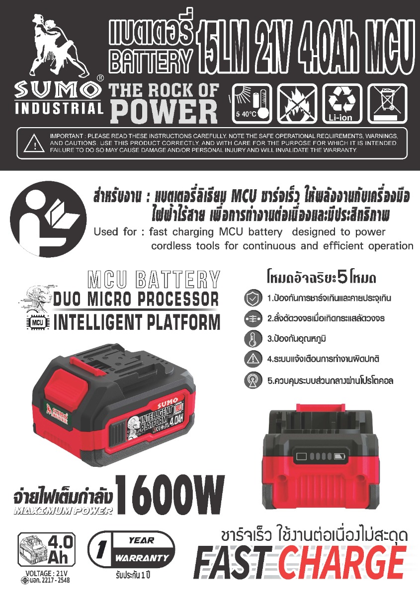 แบตเตอรี่ 15LM21V4.0Ah SUMO All In One FAST CHARGE แบตอึด ปลอดภัย ใช้งานยาวนาน และทนทานสำหรับทุกงานหนัก