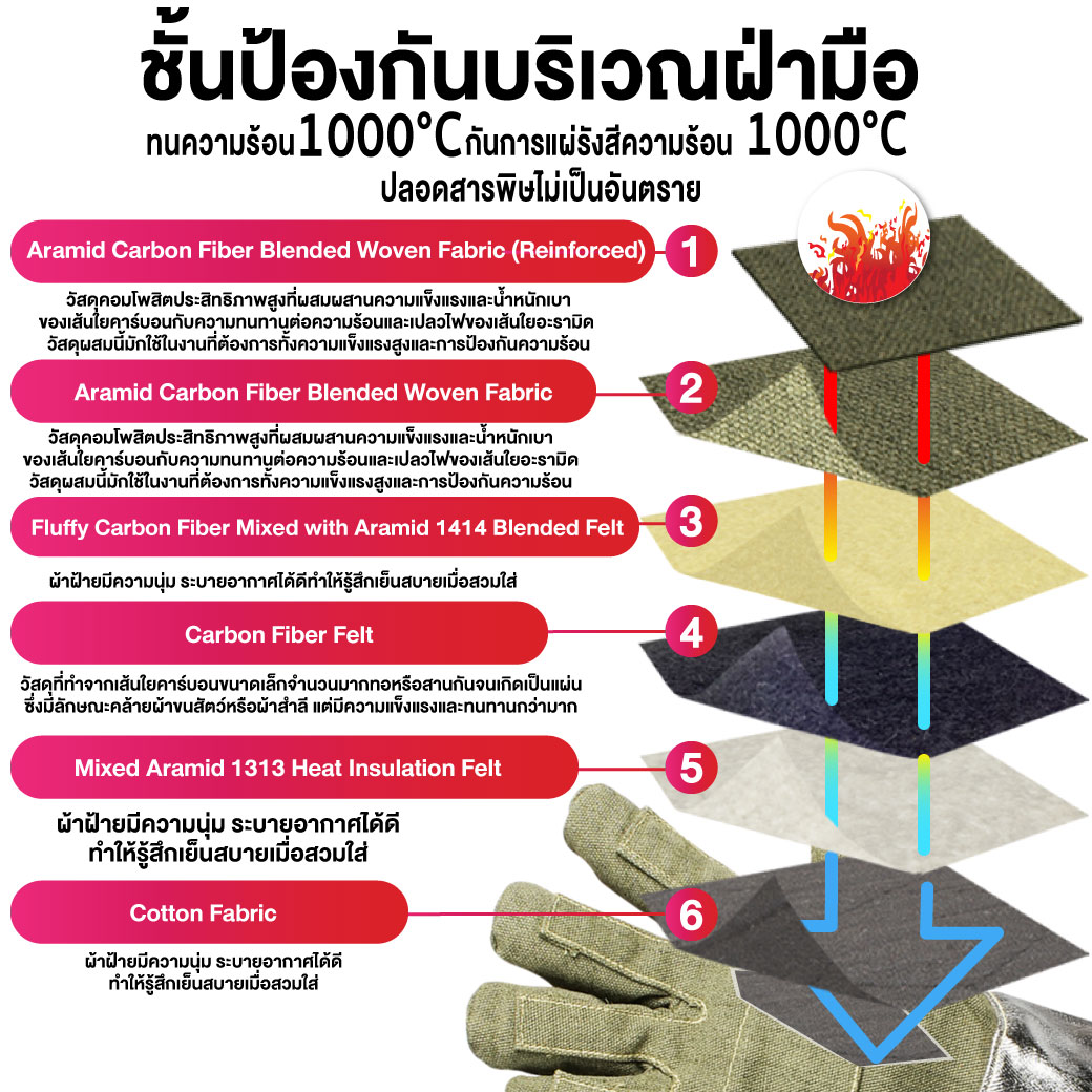 • คาร์บอนไฟเบอร์ความหนาแน่นสูงทนทานต่ออุณหภูมิสูงได้ดีเยี่ยม และเคฟล่าร์ทำให้ถุงมือมีความทนทาน