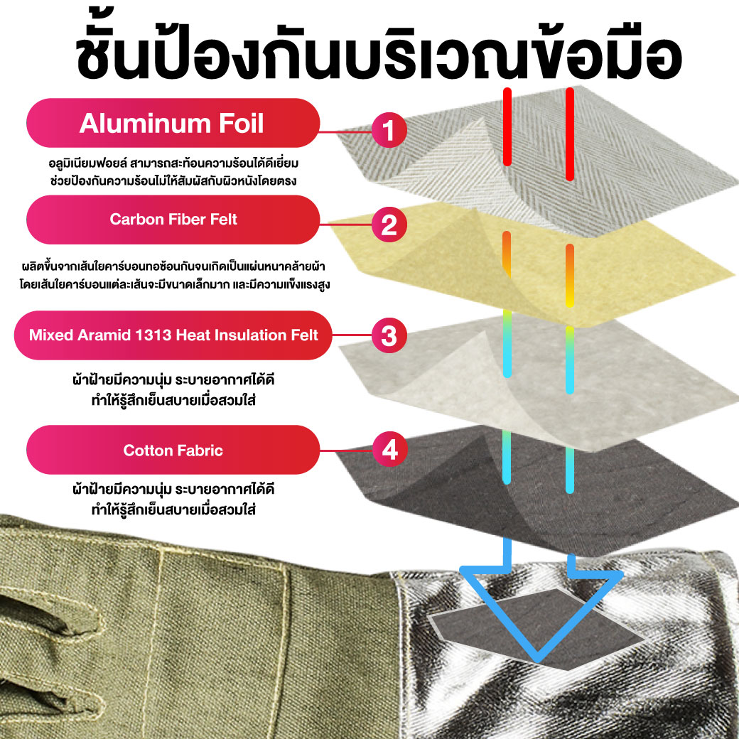 • ถุงมือกันความร้อนเคลือบอะลูมิไนซ์ ผลิตจากฟอยล์เคลือบอะลูมิไนซ์และซับในผ้าฝ้าย ปลอดสารพิษและไม่เป็นอันตราย