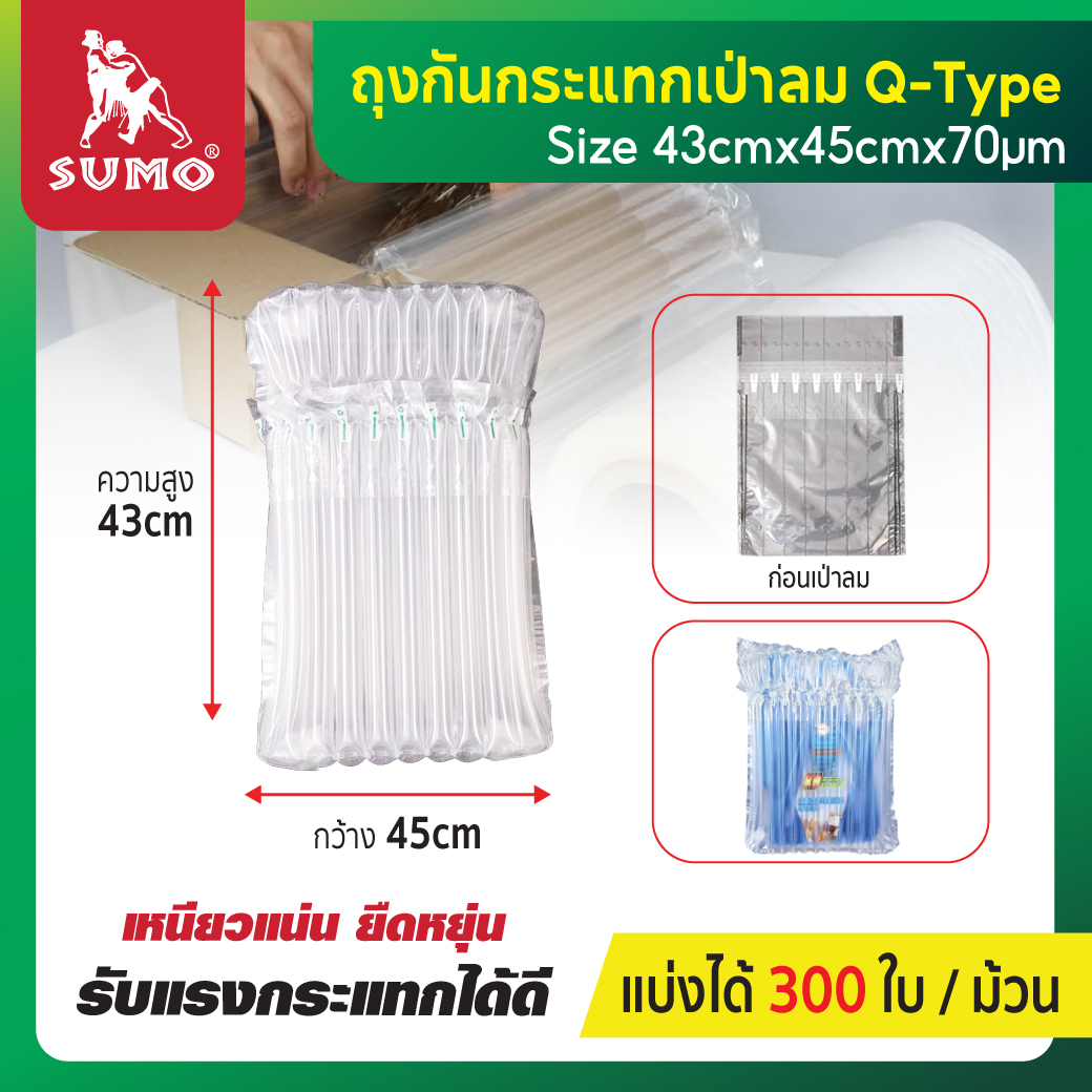 ถุงกันกระแทก Q-Type ครอบปิดป้องกันสินค้าได้รอบด้าน ทำจากพลาสติก PE ผสมไนลอน เหนียวแน่น ยืดหยุ่น รับแรงกระแทกได้ดี รับน้ำหนักได้มากถึง 80 กก.