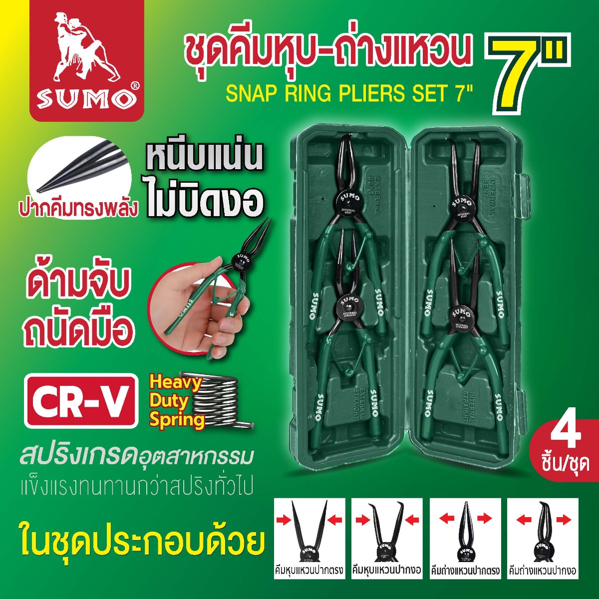 คีมหุบ-ถ่างแหวน 7" เกรดอุตสาหกรรม เหล็กโครมวานาเดียมชุบแข็ง แข็งแรงกว่าสปริงทั่วไป ทนแรงดึง-บิดงอสูง ด้ามยางกันลื่น จับถนัดมือ มีครบ 4 แบบ ครอบคลุมทุกงาน พร้อมแบบชุดกล่องให้เลือก