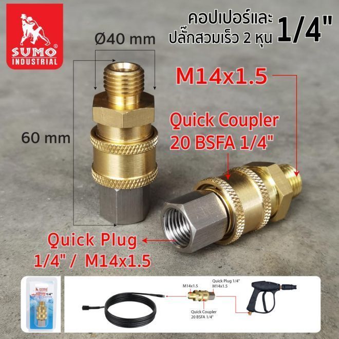 Buy ปลั๊กสวมเร็ว 1/4"/M22x1.5 แกน 14 มม. SUMO  ปลั๊กสวมเร็ว 1/4" เป็นฟังก์ชั่นเสริม เปลี่ยนข้อต่อเกลียว เป็นปลั๊กสวมเร็วเพื่อความสะดวกในการใช้งา ปลั๊กสวมเร็ว : 1/4" ข้อต่อทางออกตัวผู้ : M22x1.5 (Core 14mm.) แรงดันสูงสุด : 350bar อุณหภูมิ สูงสุด : 60°C