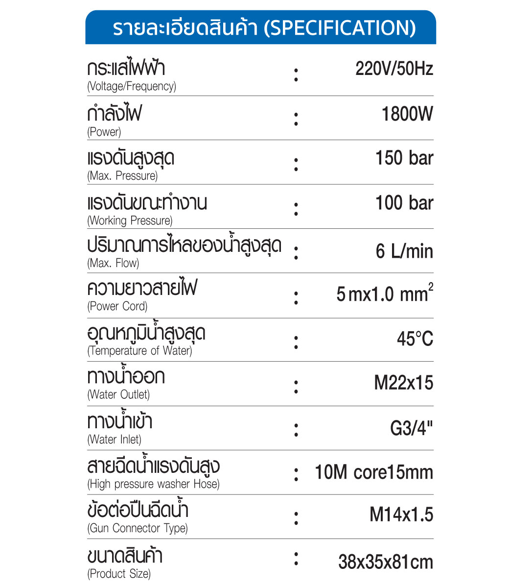 แรงดันน้ำสูงสุด 150 Bar อัตราการไหลของน้ำ 6 ลิตร/นาที กำลังไฟฟ้า 1800W ใช้ไฟ 220V
