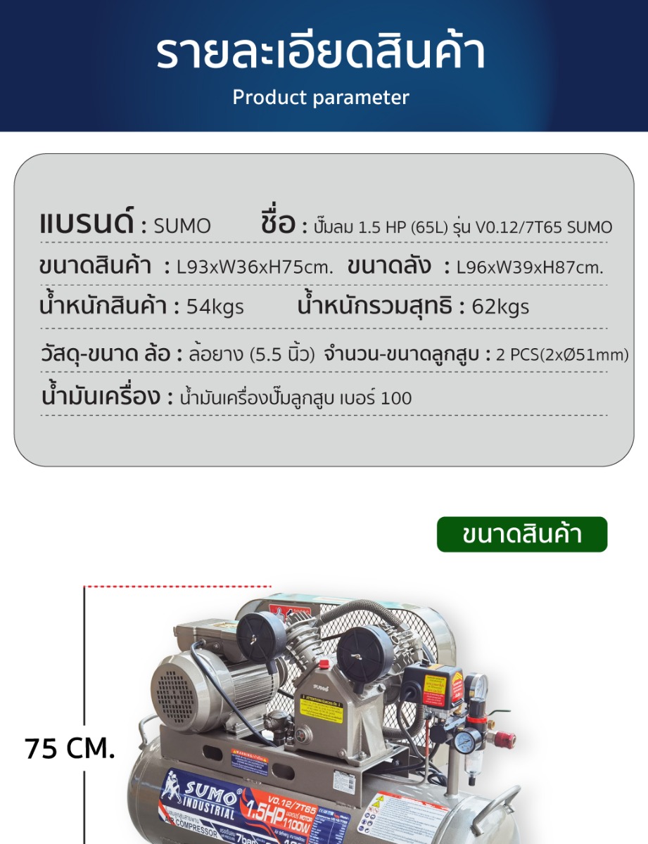 ปั๊มลม 1.5 HP (65L) รุ่น V0.12/7T65 SUMO