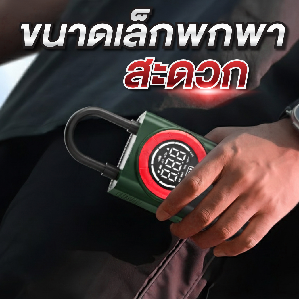 เครื่องเติมลมไร้สายแบบพกพา แรงดันลมสูงสุด 150 PSI เติมลมเร็ว 15 ลิตร/นาที มีระบบตัดอัตโนมัติเมื่อเติมลมเต็มและตรวจสอบแรงดันลมได้
