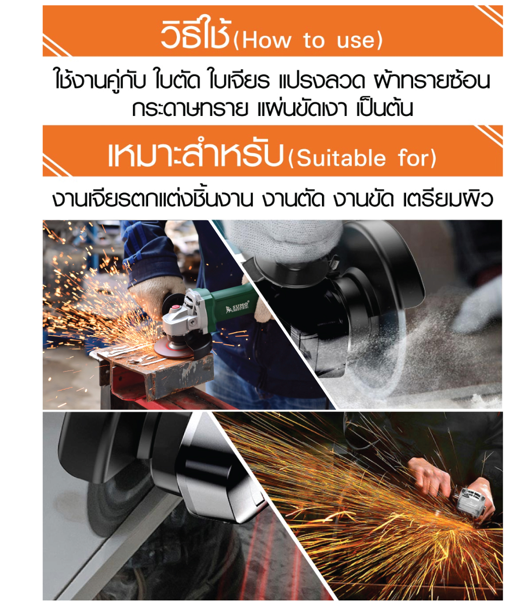 • ใช้งานคู่กับ ใบตัด ใบเจียร แปรงลวดผ้าทรายซ้อน กระดาษทราย แผ่นขัดเงา เป็นต้น