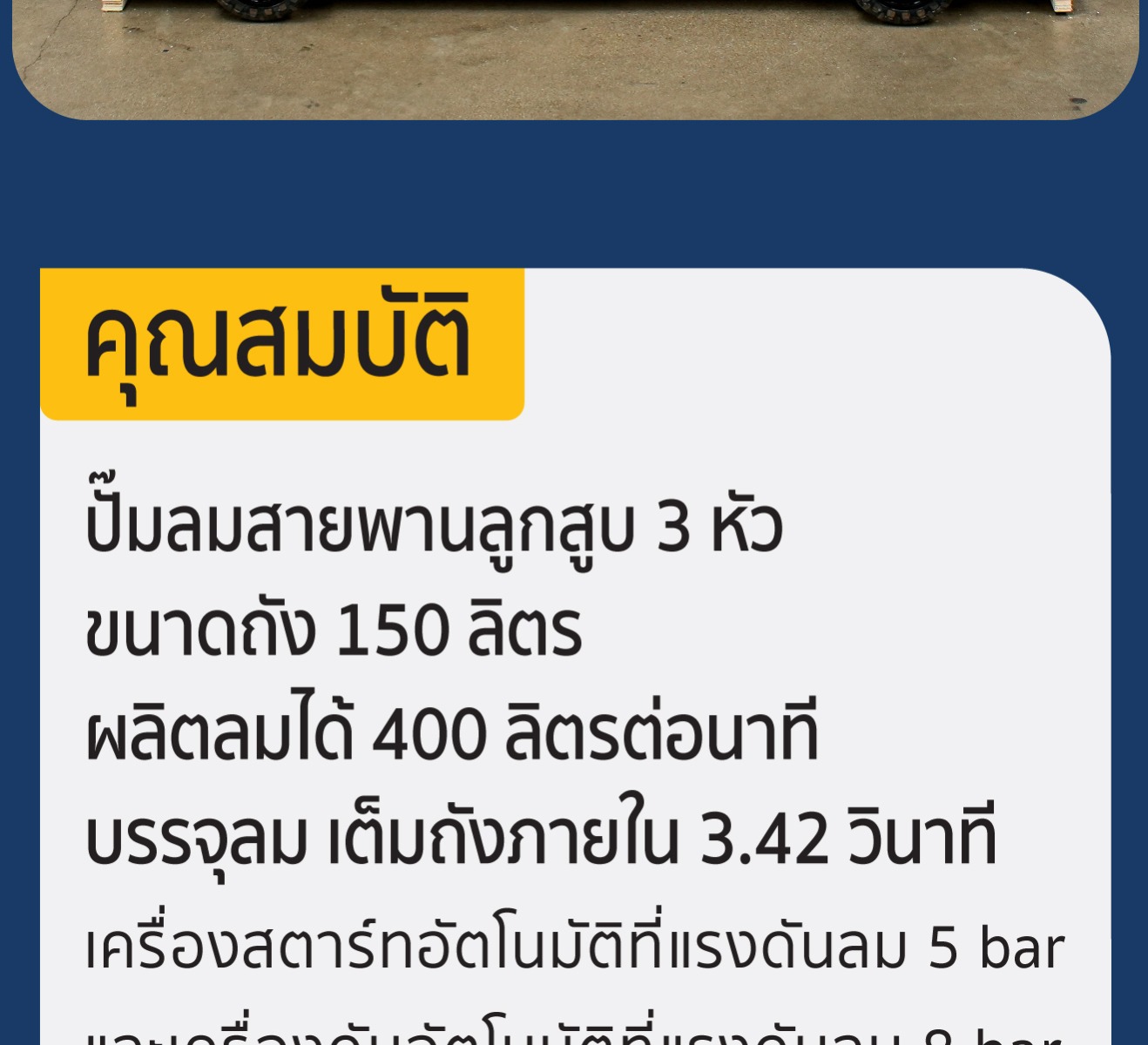 • ผลิตลมได้เร็วลมเต็มถังภายใน 3.42 นาที (0-8 bar) ถังเก็บลมขนาด 150 ลิตร