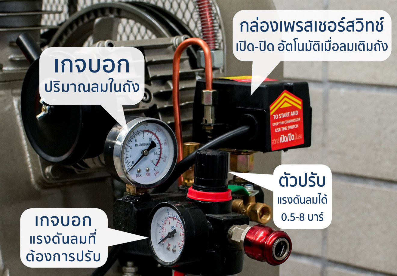 • เครื่องสตาร์ทอัตโนมัติที่แรงดันลม 5 bar  และเครื่องดับอัตโนมัติที่แรงดันลม 8 bar