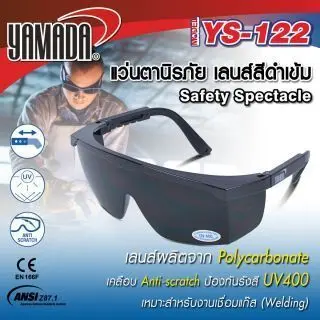 แว่นเซฟตี้ สีดำ รุ่น YS-120 YAMADA เลนส์ PC แข็งแรงทนทาน เหมาะสำหรับงานเชื่อมทองเหลือง บัดกรี