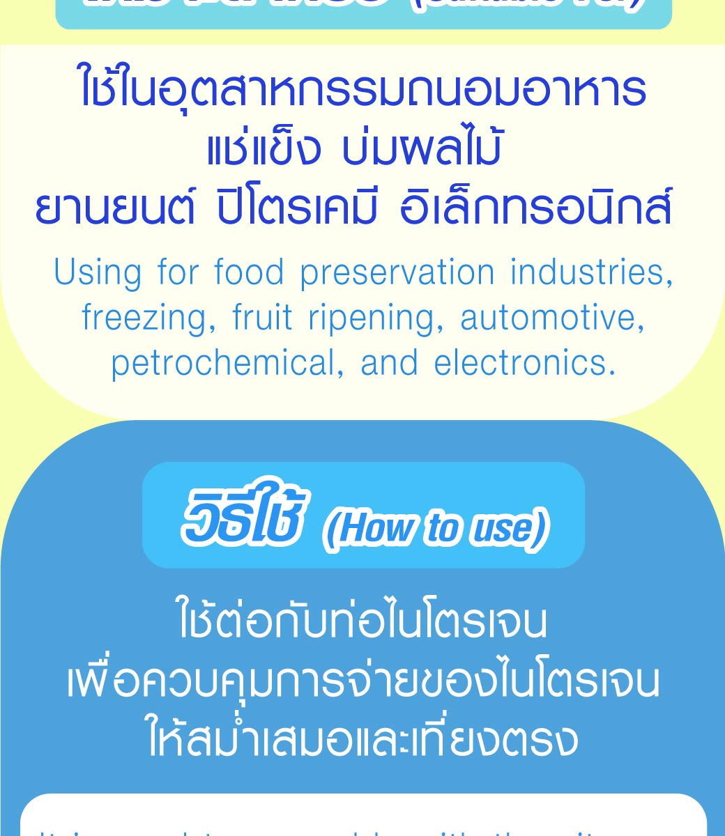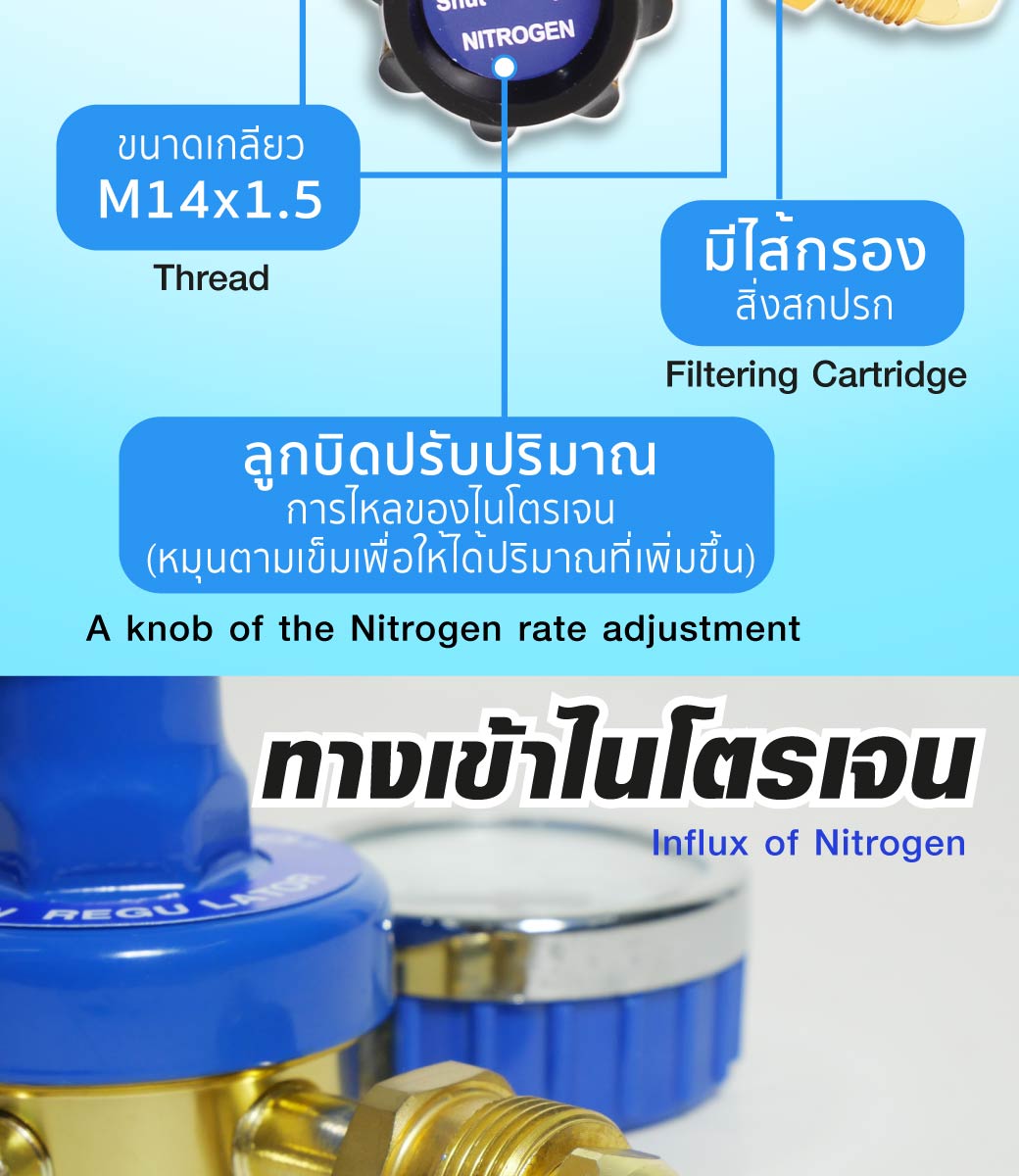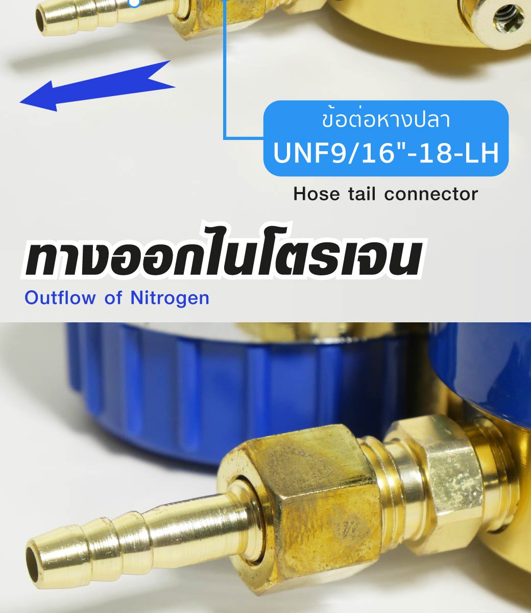 • ใช้ต่อกับท่อไนโตรเจน เพื่อควบคุมการจ่ายของไนโตรเจนให้สม่ำเสมอและเที่ยงตรง