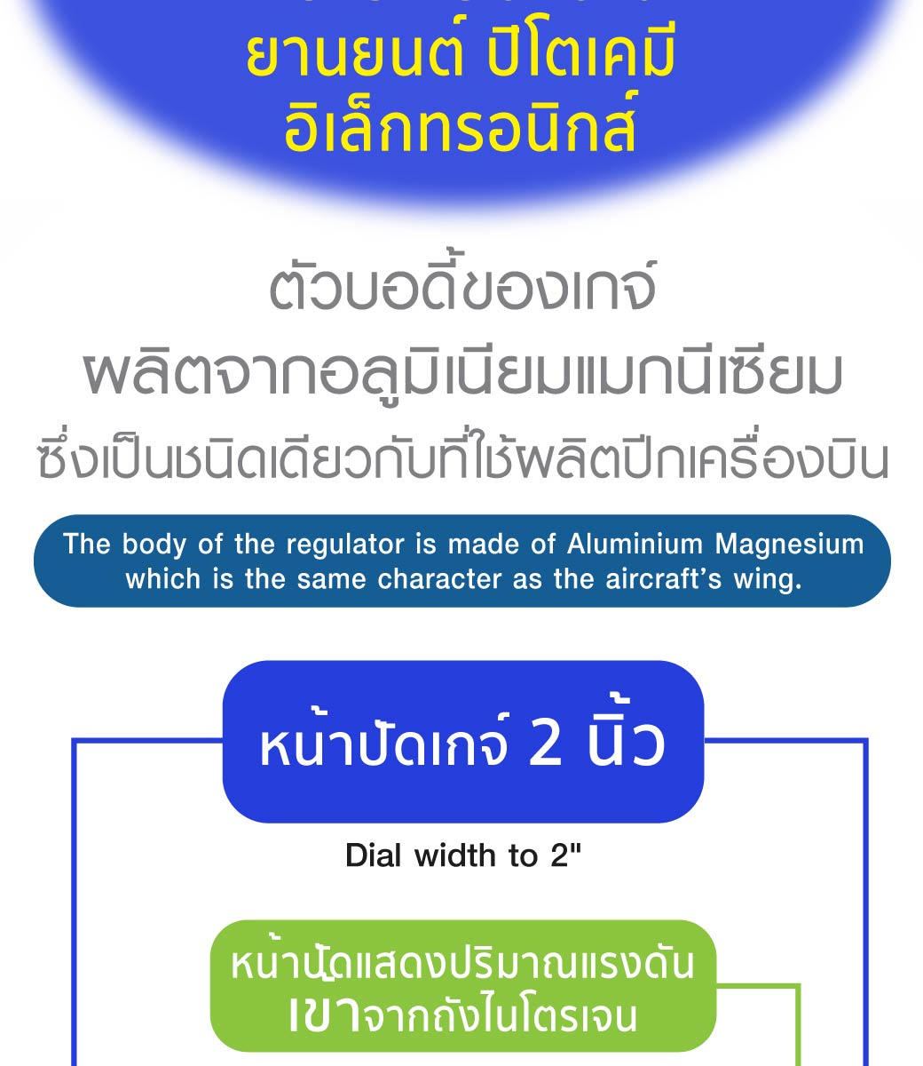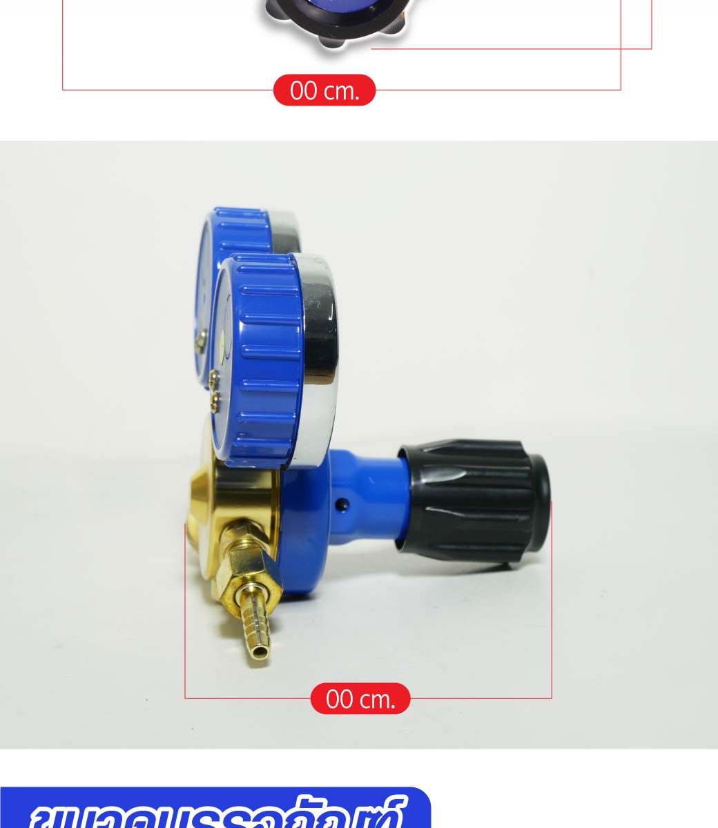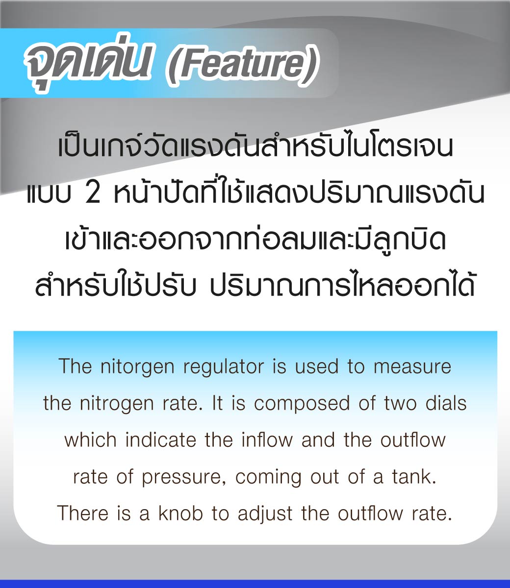 • เป็นเกจ์วัดแรงดันสำหรับไนโตรเจน แบบ 2 หน้าปัด ที่ใช้แสดงปริมาณแรงดันเข้าและออกจากท่อลมและมีลูกบิดสำหรับใช้ปรับปริมาณการไหลออกได้